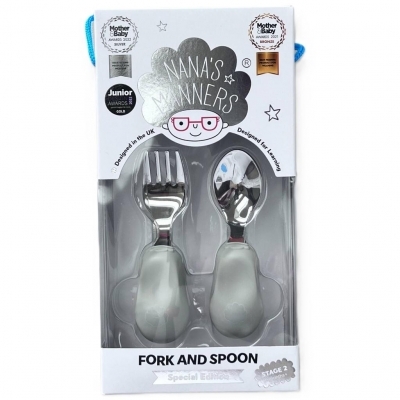 Przeznaczone dla dzieci, które rozwijają umiejętność posługiwania się prawą i lewą dłonią w koordynacji ręka-oko. Sztućce ćwiczące uścisk dłoniowy (Palmar Grip) oraz chwyt cęgowy, używając palców wskazujących i kciuka. Wspierają budowanie pewności siebie podczas samodzielnego spożywania posiłków.