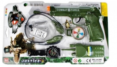 Zestaw zawiera pistolet, krótkofalówkę, słuchawki, kompas, zegarek oraz odznakę.