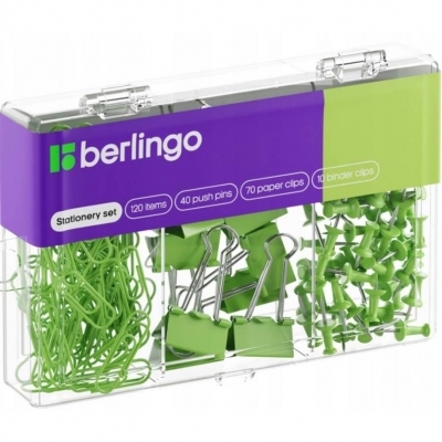Zestaw zielony: 70 spinaczy, 40 pinezek tablicowych, 10 klipów, berlingo