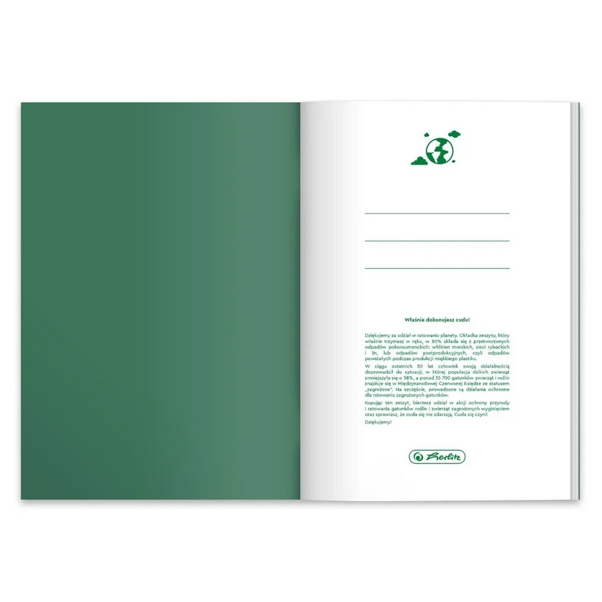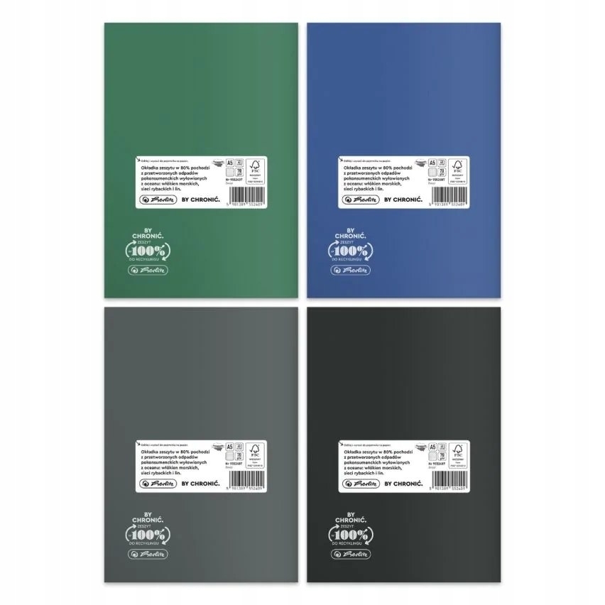 - 80% użytego surowca na okładkę pochodzi z recyclingu pokonsumenckiego, a dokładniej ze śmieci zebranych z wód oceanów