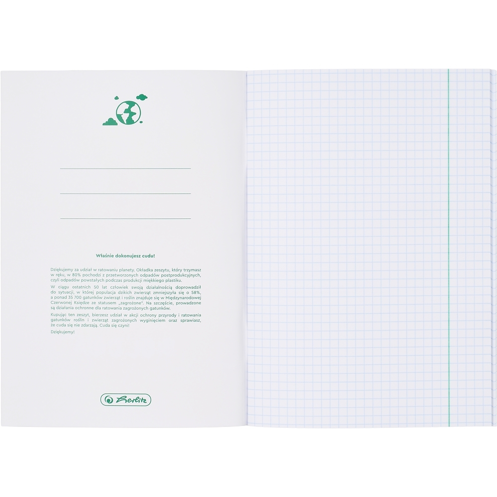 Zeszyty przedmiotowe Herlitz Eco PP to idealne rozwiązanie dla uczniów, którzy chcą łączyć funkcjonalność z dbałością o środowisko. Ich wyjątkowa konstrukcja opiera się na dwuwarstwowej okładce – zewnętrznej, wykonanej z mlecznego polipropylenu, oraz wewnętrznej, z zadrukowaną grafiką przedmiotową. Co ważne, aż 30% materiału pochodzi z przetworzonych odpadów pokonsumenckich, takich jak sieci rybackie, liny i włókna morskie wyłowione z oceanów. Okładka jest wodoodporna i trwała, dzięki czemu nie wymaga dodatkowych osłon – skutecznie chroni zawartość zeszytu nawet przy intensywnym użytkowaniu. Niebieska liniatura z zielonym marginesem doskonale wpisuje się w ekologiczny styl kolekcji, a na stronie tytułowej znajduje się adresówka do podpisania, natomiast wewnątrz – ściągi z wybranego przedmiotu.