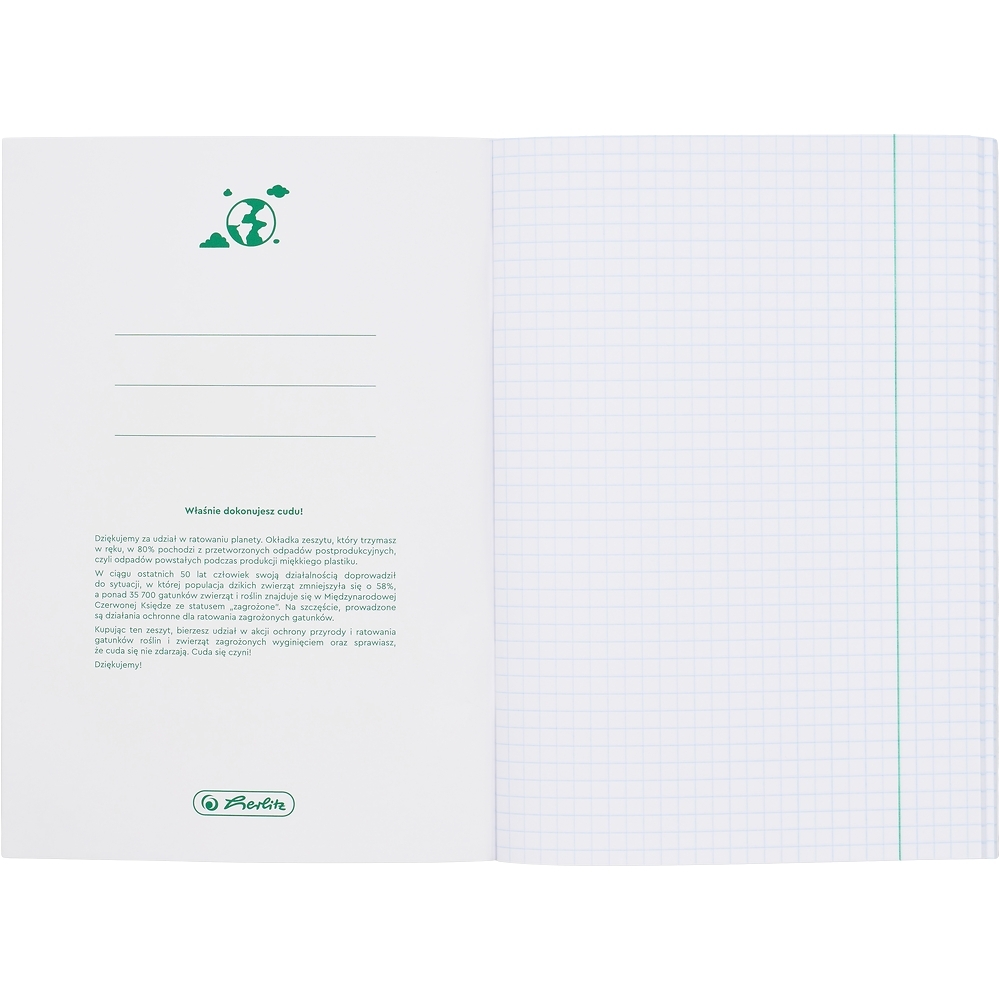 Zeszyty przedmiotowe Herlitz Eco PP to idealne rozwiązanie dla uczniów, którzy chcą łączyć funkcjonalność z dbałością o środowisko. Ich wyjątkowa konstrukcja opiera się na dwuwarstwowej okładce – zewnętrznej, wykonanej z mlecznego polipropylenu, oraz wewnętrznej, z zadrukowaną grafiką przedmiotową. Co ważne, aż 30% materiału pochodzi z przetworzonych odpadów pokonsumenckich, takich jak sieci rybackie, liny i włókna morskie wyłowione z oceanów. Okładka jest wodoodporna i trwała, dzięki czemu nie wymaga dodatkowych osłon – skutecznie chroni zawartość zeszytu nawet przy intensywnym użytkowaniu. Niebieska liniatura z zielonym marginesem doskonale wpisuje się w ekologiczny styl kolekcji, a na stronie tytułowej znajduje się adresówka do podpisania, natomiast wewnątrz – ściągi z wybranego przedmiotu.