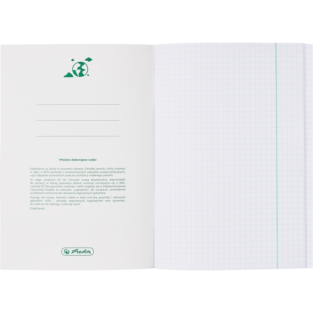 Zeszyty przedmiotowe Herlitz Eco PP to idealne rozwiązanie dla uczniów, którzy chcą łączyć funkcjonalność z dbałością o środowisko. Ich wyjątkowa konstrukcja opiera się na dwuwarstwowej okładce – zewnętrznej, wykonanej z mlecznego polipropylenu, oraz wewnętrznej, z zadrukowaną grafiką przedmiotową. Co ważne, aż 30% materiału pochodzi z przetworzonych odpadów pokonsumenckich, takich jak sieci rybackie, liny i włókna morskie wyłowione z oceanów. Okładka jest wodoodporna i trwała, dzięki czemu nie wymaga dodatkowych osłon – skutecznie chroni zawartość zeszytu nawet przy intensywnym użytkowaniu. Niebieska liniatura z zielonym marginesem doskonale wpisuje się w ekologiczny styl kolekcji, a na stronie tytułowej znajduje się adresówka do podpisania, natomiast wewnątrz – ściągi z wybranego przedmiotu.