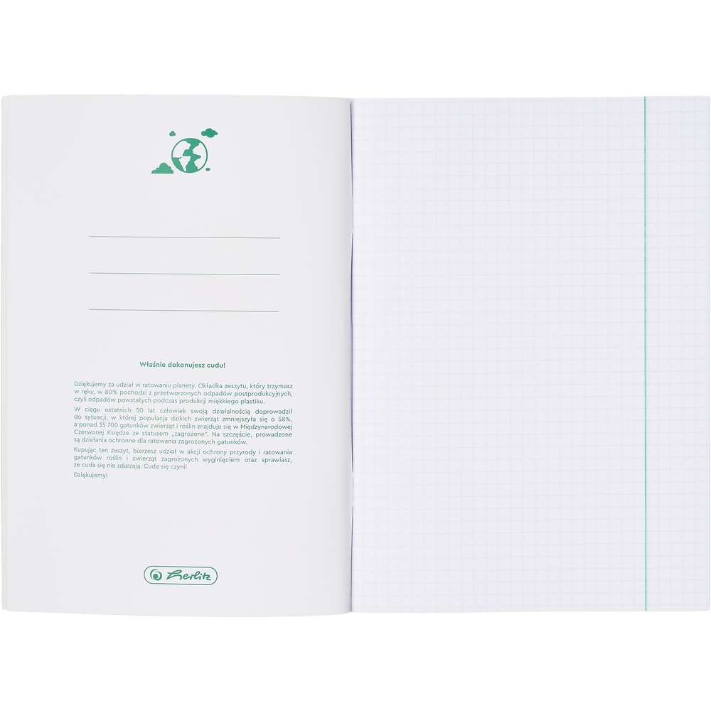 Zeszyty przedmiotowe Herlitz Eco PP to idealne rozwiązanie dla uczniów, którzy chcą łączyć funkcjonalność z dbałością o środowisko. Ich wyjątkowa konstrukcja opiera się na dwuwarstwowej okładce – zewnętrznej, wykonanej z mlecznego polipropylenu, oraz wewnętrznej, z zadrukowaną grafiką przedmiotową. Co ważne, aż 30% materiału pochodzi z przetworzonych odpadów pokonsumenckich, takich jak sieci rybackie, liny i włókna morskie wyłowione z oceanów. Okładka jest wodoodporna i trwała, dzięki czemu nie wymaga dodatkowych osłon – skutecznie chroni zawartość zeszytu nawet przy intensywnym użytkowaniu. Niebieska liniatura z zielonym marginesem doskonale wpisuje się w ekologiczny styl kolekcji, a na stronie tytułowej znajduje się adresówka do podpisania, natomiast wewnątrz – ściągi z wybranego przedmiotu.