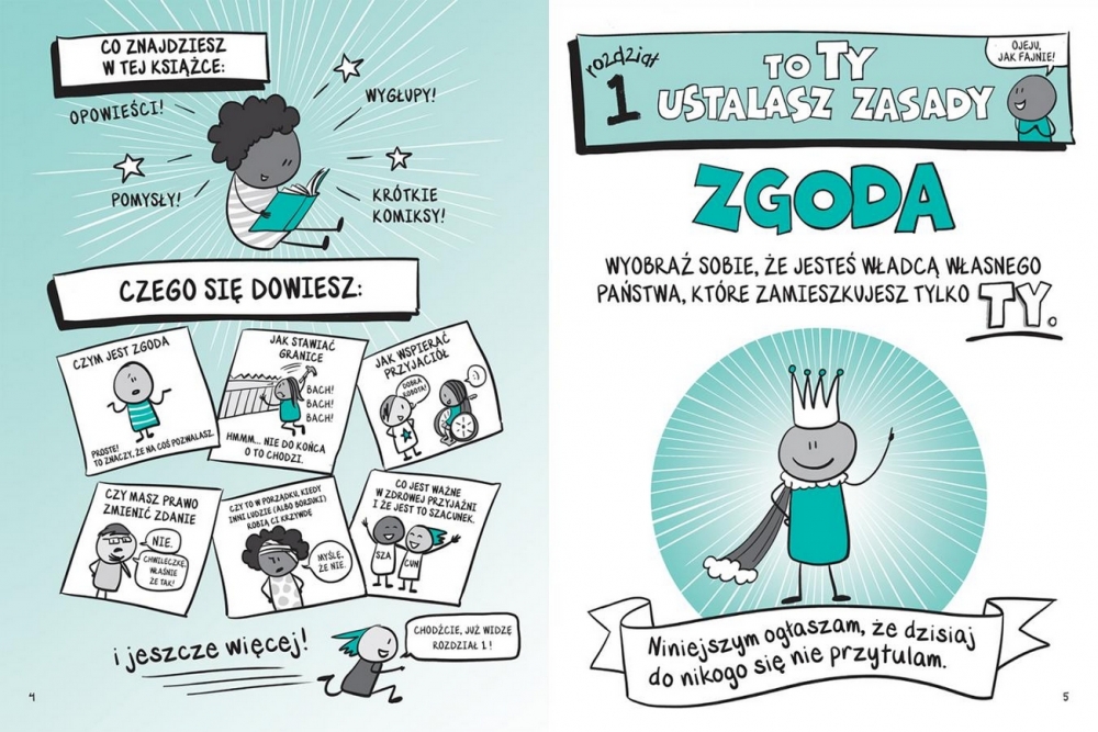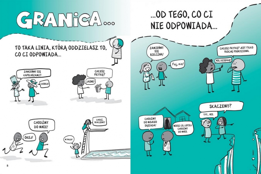 Autorka ilustruje każdy przykład komiksowym rysunkiem, który podpowiada dzieciom, jak jasno komunikować własne potrzeby, szanując przy tym granice innych ludzi.
