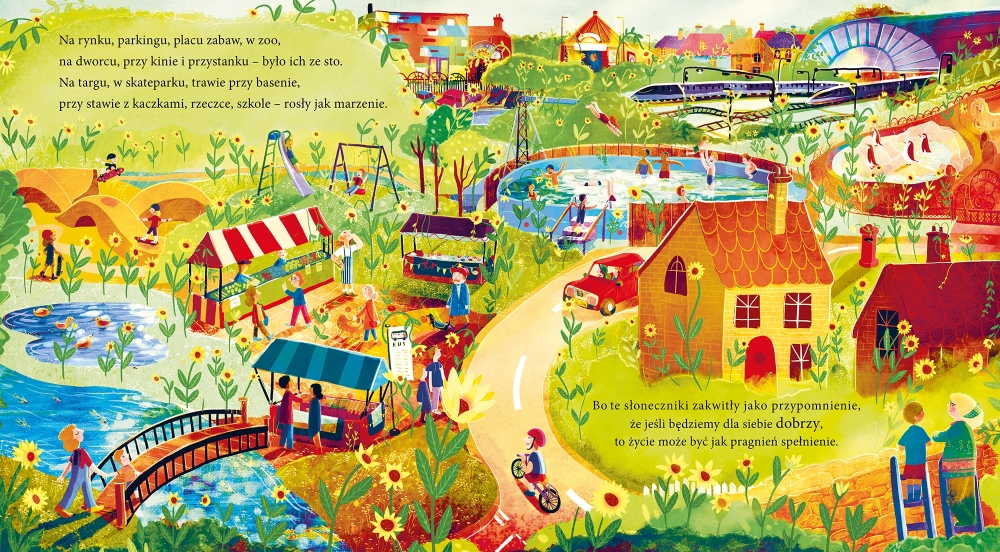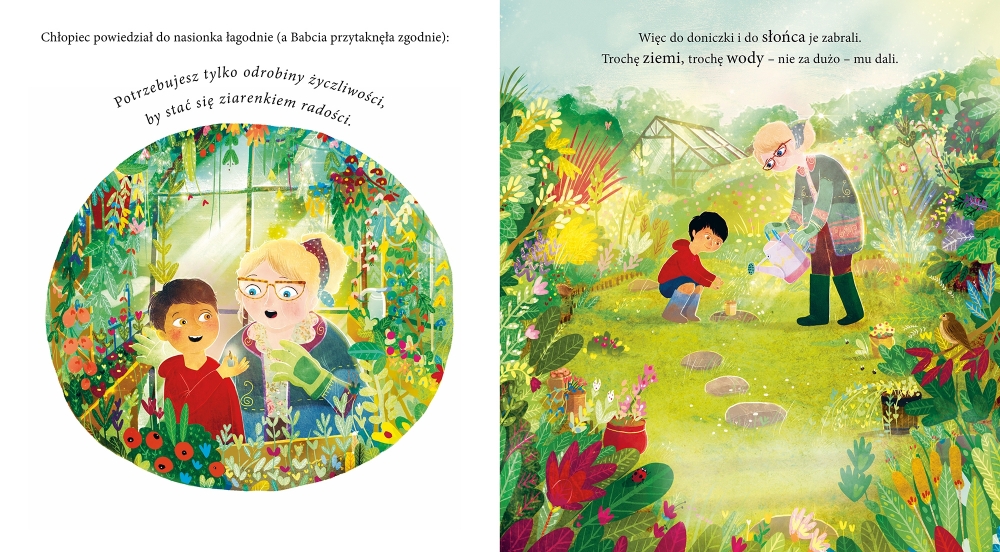 Znalazł je chłopiec, pokazał babci i powiedział: „Potrzebujesz tylko odrobiny życzliwości, by stać się ziarenkiem radości”. I razem z Babcią zaopiekowali się nasionkiem. Najpierw wyrosła łodyga. Była coraz większa i większa… a potem zakwitł ogromny słonecznik i jak słońce rozświetlił radością twarze i serca wszystkich w miasteczku.
