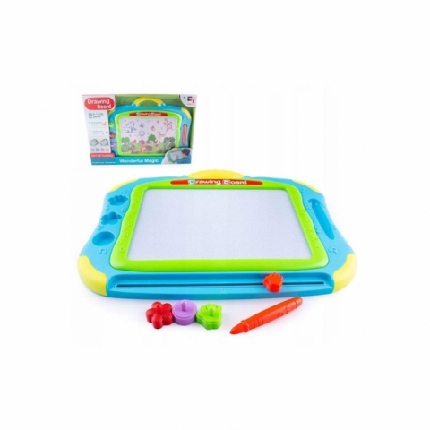 Znikopis to zabawka edukacyjna i idealny pomysł na kreatywną zabawę dla dziecka. Tablica magnetyczna - jak działa? Pod jej powierzchnią znajdują się opiłki, które podczas malowania na tablicy specjalnym długopisem układają się w rysunek. Namalowany obrazek możemy łatwo wymazać - wystarczy przeciągnąć specjalnym suwakiem, a rysunek zniknie i można narysować ponownie nowy. Doskonała zabawa połączona z elementem nauki. Dziecko ma możliwość ćwiczenia rysowania i pisania. W zestawie tablica, pisak pieczątki oraz szablony do rysowania.