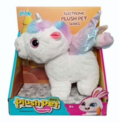 Pluszowy jednorożec posiada błyszczące skrzydełka i kolorową grzywę. Wykonany z miękkiego pluszu. Jednorożec potrafi chodzić. Zabawka działa na baterie AA. Baterie nie są załączone do zabawki. Produkt dla dzieci od 3 lat. Zapakowana w kartonowe pudełko. Podane wymiary są wymiarami opakowania.