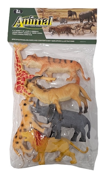 Zestaw figurek dzikich zwierząt. W komplecie znajdują się różne modele zwierząt, takich jak lew, tygrys, żyrafa, słoń oraz inne gatunki. Produkt wykonany z tworzywa sztucznego, idealny do zabawy tematycznej i nauki rozpoznawania zwierząt. Zabawka przeznaczona dla dzieci od lat 3. Produkt zapakowany w przezroczysty worek. Podane wymiary są wymiarami produktu w opakowaniu.