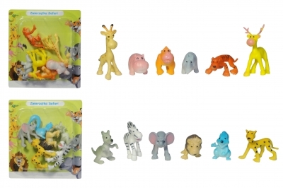 Zestaw 6 figurek zwierząt występujących na sawannie w dwóch różnych zestawach. M.in.: goryl, hipopotam, nosorożec, żyrafa, tygrys lub słoń, lew, zebra, lampard