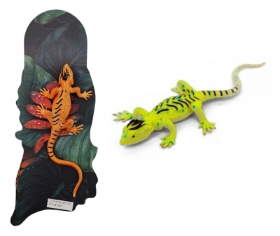 Elastyczna figurka jaszczurki wykonana z miękkiego materiału. Zabawka posiada efekt zmiany koloru pod wpływem temperatury wody, co sprawia, że podczas zabawy zmienia swój wygląd. Realistyczny kształt oraz wyraziste kolory nadają figurce atrakcyjny wygląd. Produkt przytwierdzony do kartonowej podstawki. Podane wymiary są wymiarami produktu w opakowaniu.