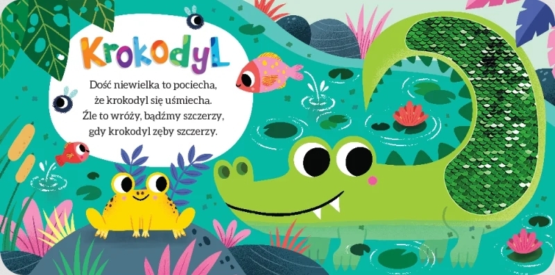 Barwne i odpowiednie dla dziecka ilustracje, ciekawa tematyka oraz zabawne wierszyki o bohaterach książeczki połączone z zabawą w dotykanie cekinowych elementów. Sensoryczna książeczka do stymulowania zmysłów malucha.