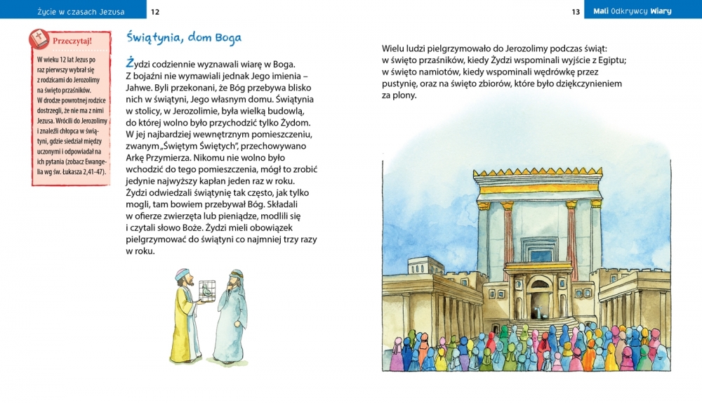 W tym tomiku dowiemy się wszystkiego, co istotne i ciekawe o życiu w czasach Jezusa. Mali chrześcijanie przeczytają m.in. o geografii Judei i wpływach Rzymu na ten obszar kulturowy. Będą się mieli okazję przekonać, jak wyglądały domy Izraelitów, co jedli i w co się ubierali, gdzie spotykali się na modlitwie, jak spędzali wolny czas, jakie mieli zwyczaje i jakie wykonywali zawody.